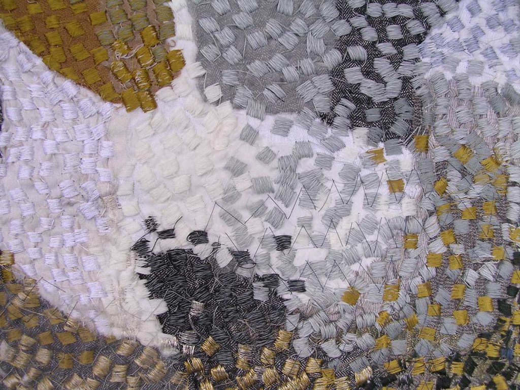 Recent work has explored pattern in the urban landscape, the use and re-use of textiles, mending, piecing and patching, the Ulster Linen Industry and the impact of limitations on creative practice. Current work explores the importance of space, balance and tension in composition and is a response to an interest in the Basic Design Movement, an approach to art education practiced from the 60’s to the 80’s.