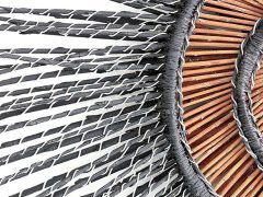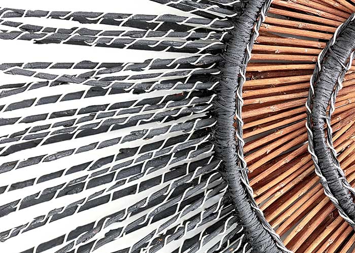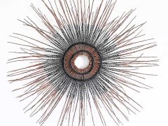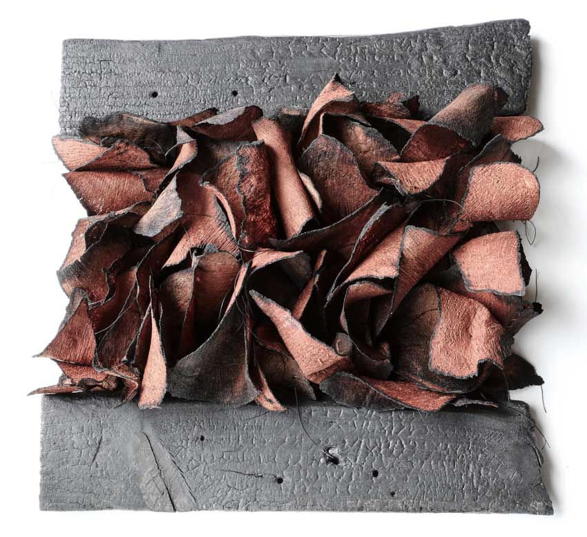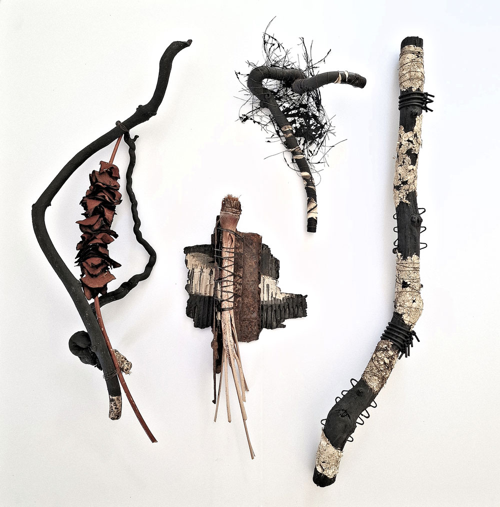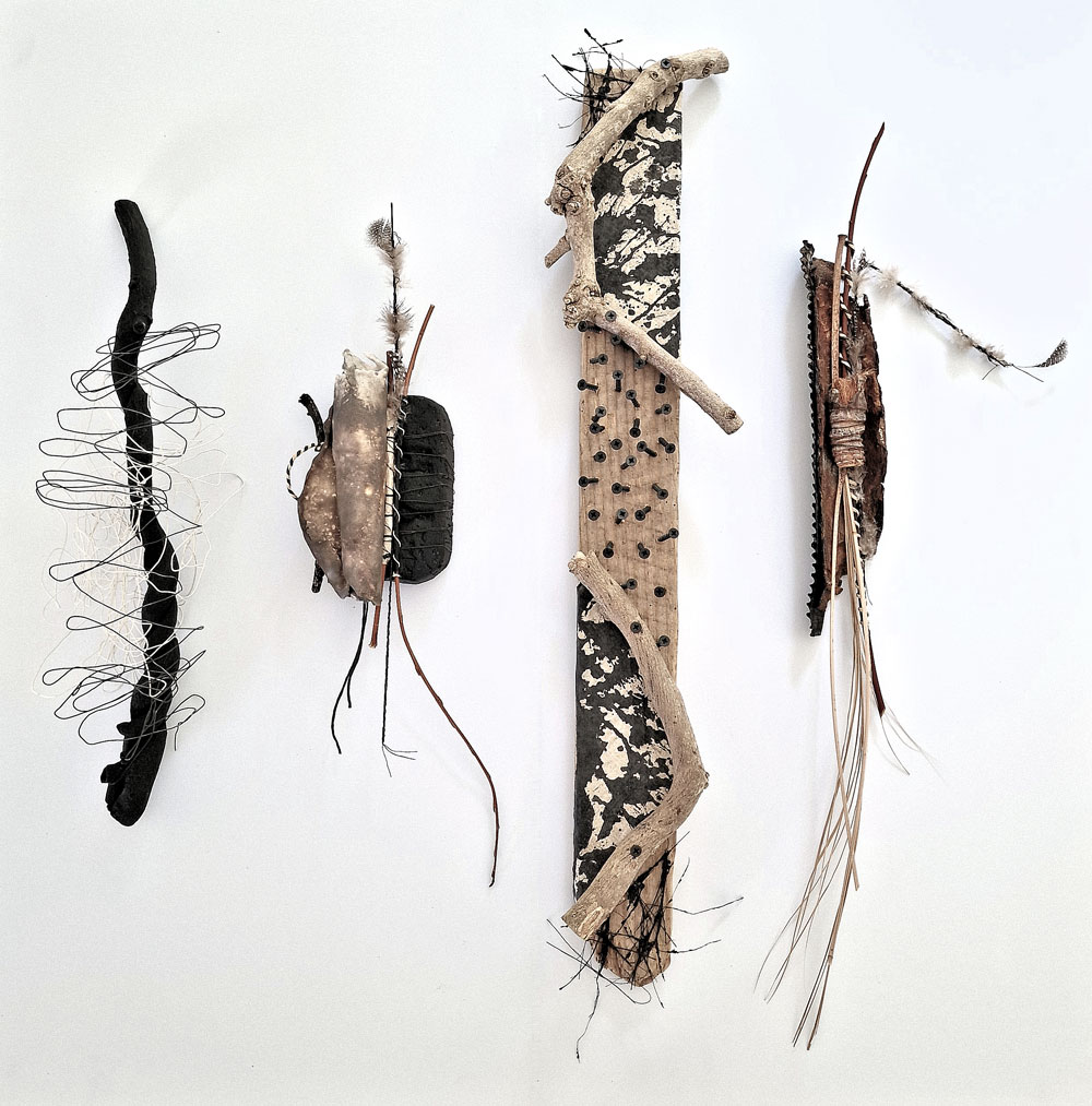 Working directly with materials, she juxtaposes a diverse range of contrasting materials…fragile with hard, natural with man-made. Techniques used are as varied as her materials. Her preferred method of creating form is through construction. Rather than direct representation, she aims to utilise the intrinsic qualities of materials and processes, to evoke associations and carry the essence of the theme.