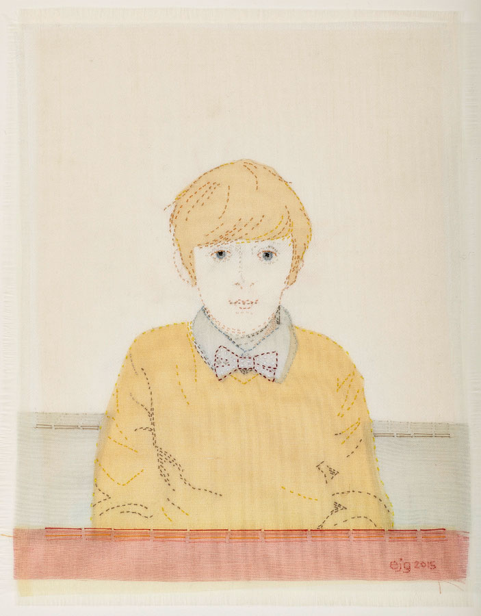 In 2015 keen to stitch children that weren’t my own, I approached my neighbours with an idea for a project called ‘Kids Today’. I live on a small cul–der-sac in South East London and very unusually, lots of children play games together in the street. They ride bikes and roller skate and dress up and make movies. They climb lamp-posts and kick balls and fall out and make up. They have picnics and water fights and they grow up together. One by one they came and sat at my kitchen table, most eager to take part in the project, some less sure but keen not to miss out. In the end I made twelve portraits, I enjoyed their differences particularly the different ages and heights and the clothes they chose to wear.