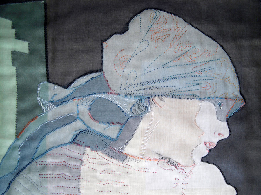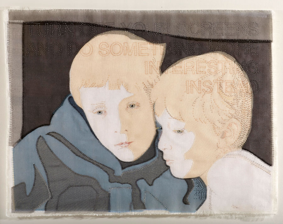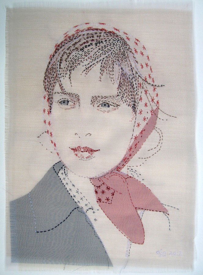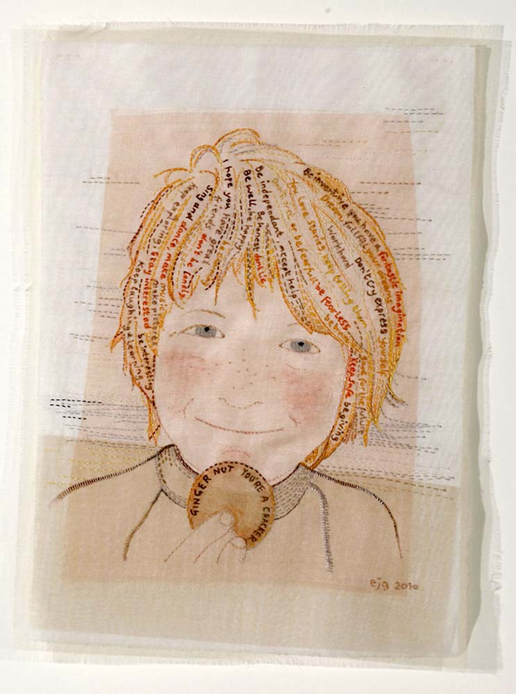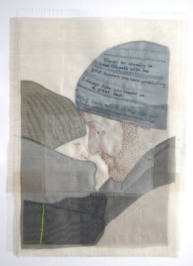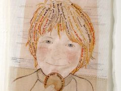 My current practice focuses on hand stitched textile portraits. In 2009 I made a portrait of my youngest son, embroidered with my thoughts wishes and aspirations. This piece inspired a series of portraits of my family examining relationships between family members, the joys and frustrations. I am very interested in the contradictory nature of our society, the mixed messages we are bombarded with and how we navigate and disseminate these messages.