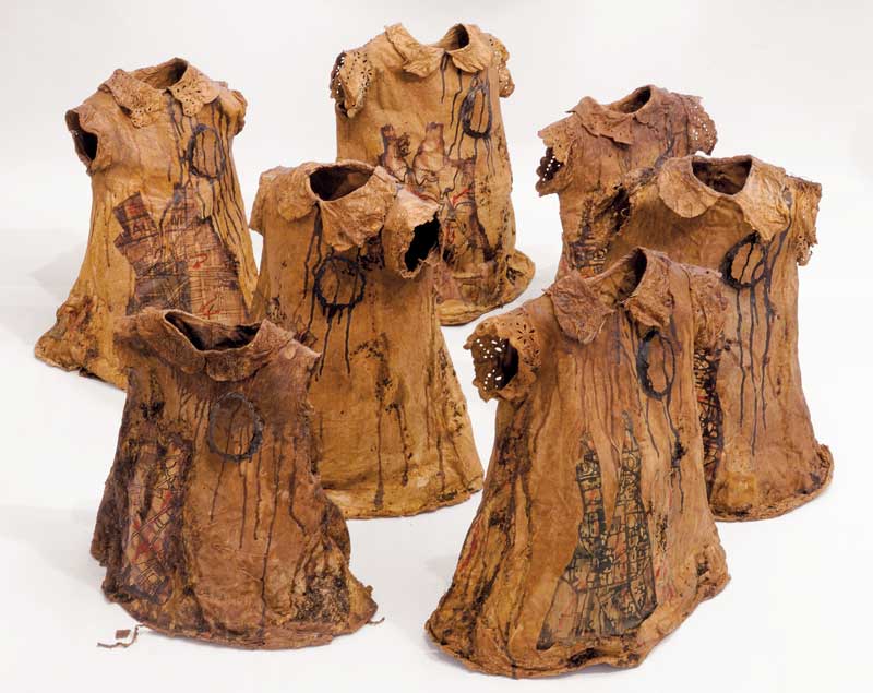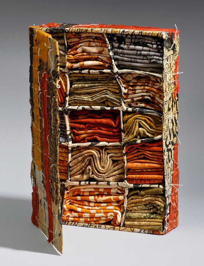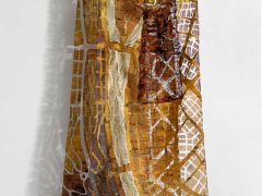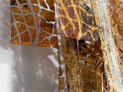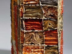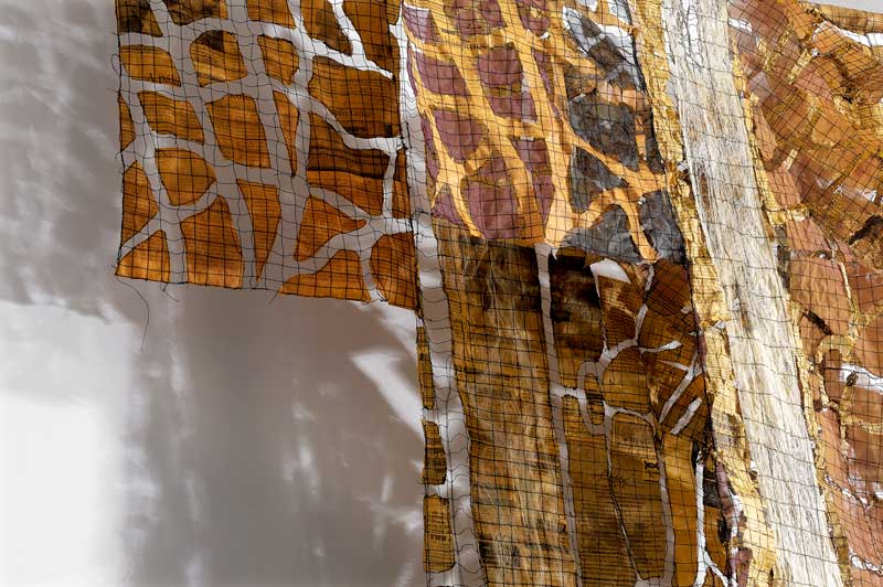 Eszter Bornemisza is a fiber artist living in Budapest, Hungary working with recycled paper, textiles and other found soft materials. Trained and having worked as a mathematician she began orienting to textile arts in the mid ‘90ties. The basic process of her creation is machine stitching, with additional elements of printing, dyeing and painting. After having made art quilts for more than ten years, her interest has turned to creating transparent wall-hangings, objects and installations using ripped, overprinted newspaper.