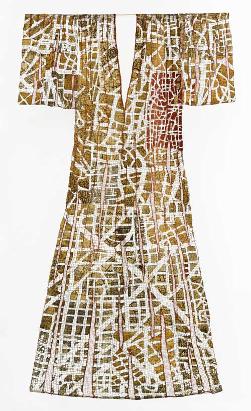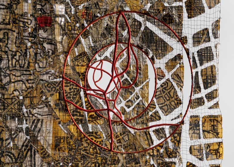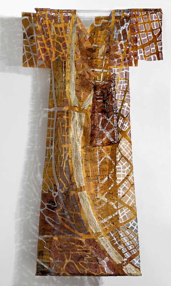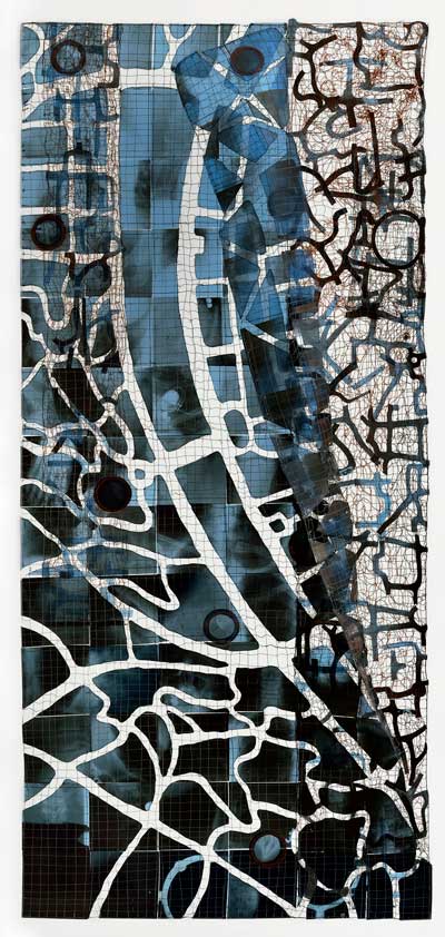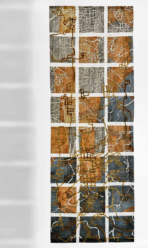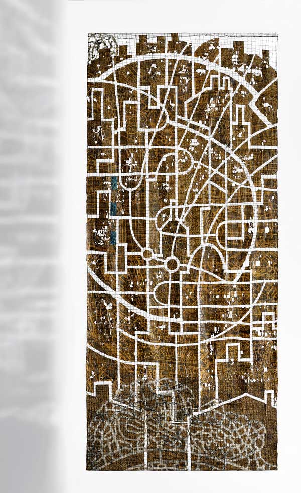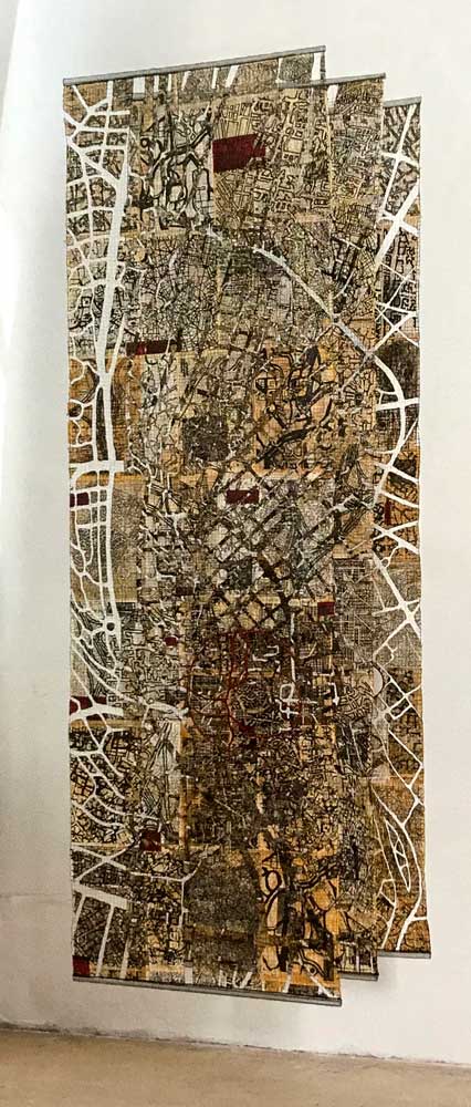 The fragmented, distorted or disintegrated city plans are used as the silt of the past, blended with modern highway and metro layouts, patterns of present urban life. She considers maps as imprints of our living in a system, which like labyrinths offer a rich ground for associations, deepening our understanding of our life and circumstances.