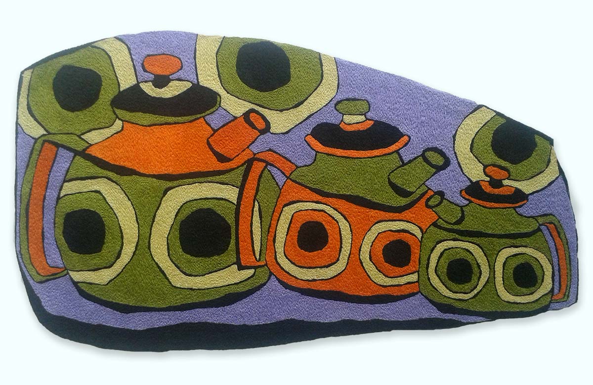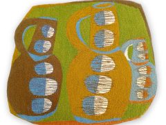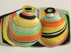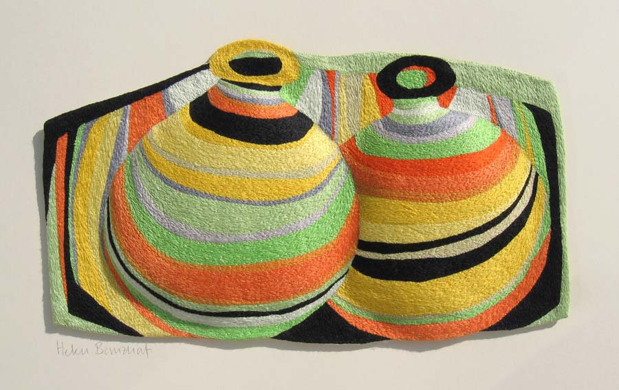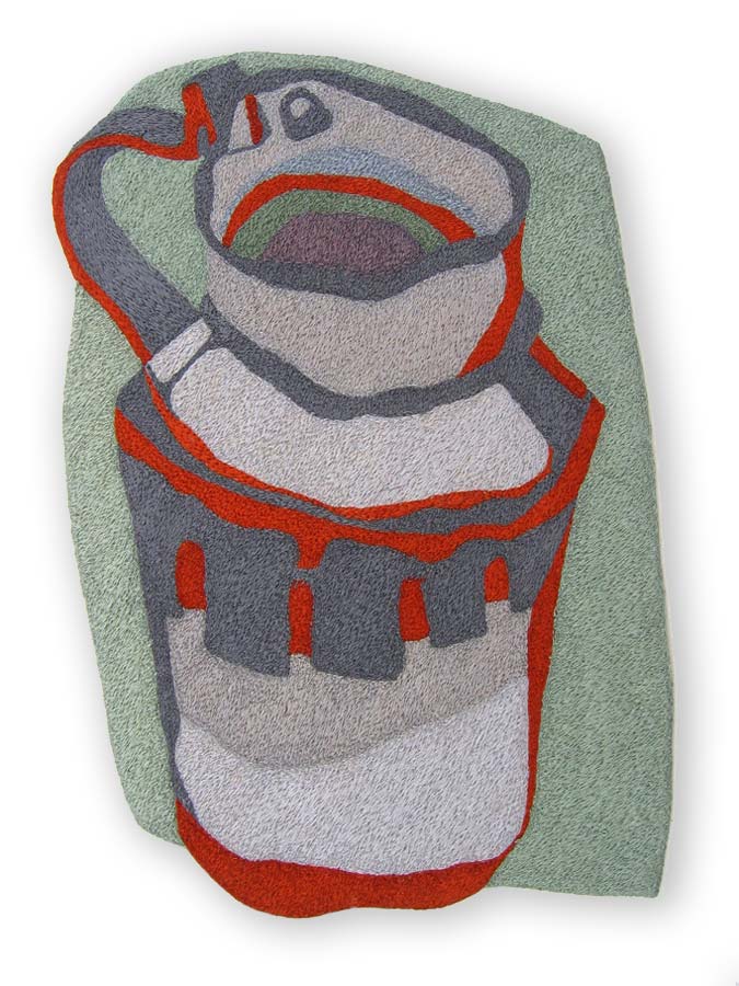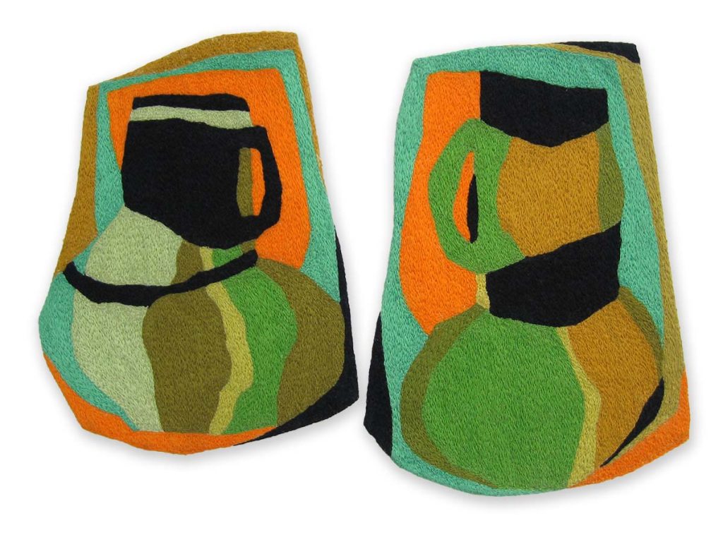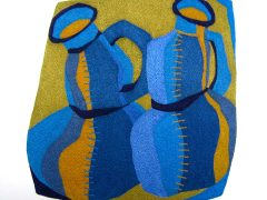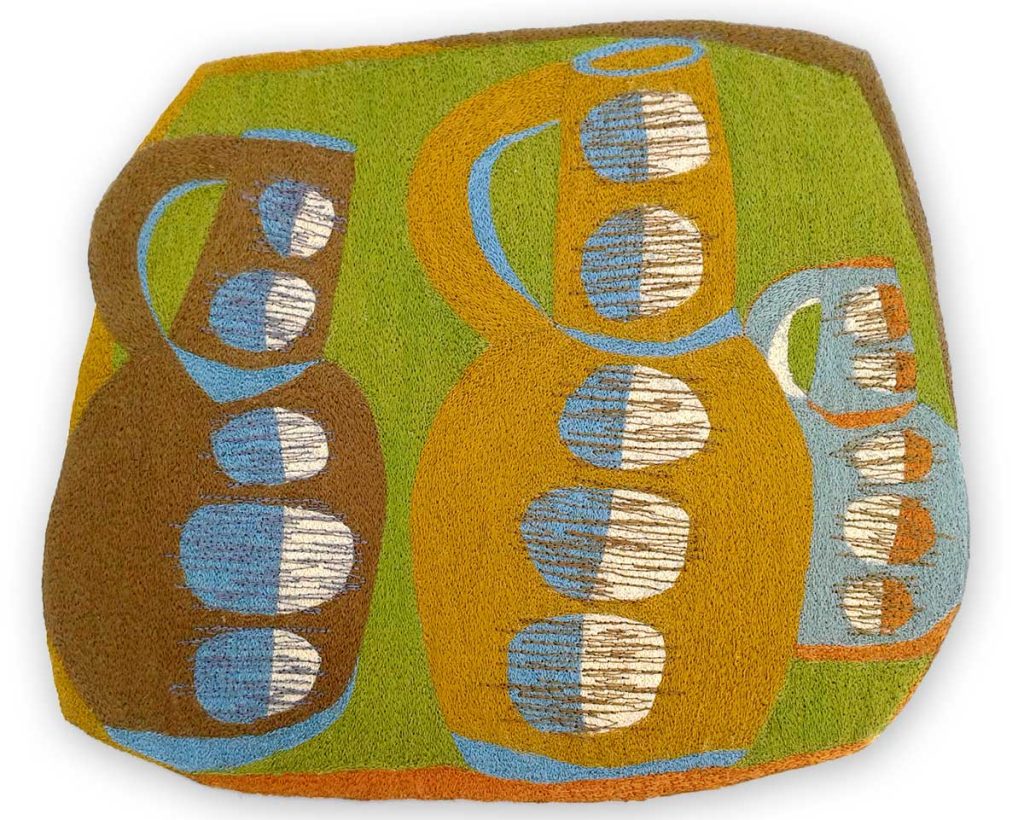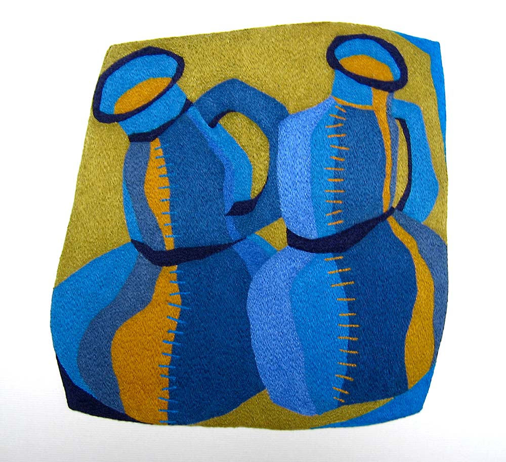 When I first began making decorative textiles I had to have an actual ceramic piece as my inspiration. Its shape, form and colours spurred me on with the design. I loved recreating these three dimensional pieces in stitches. Nowadays, most of my depicted vessels don’t exist. They are figments of my imagination. And what I find most exciting is that my initial design bears little resemblance to the finished embroidery. The patterns, shapes and colours change and evolve as I work the piece.