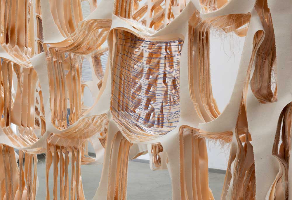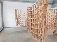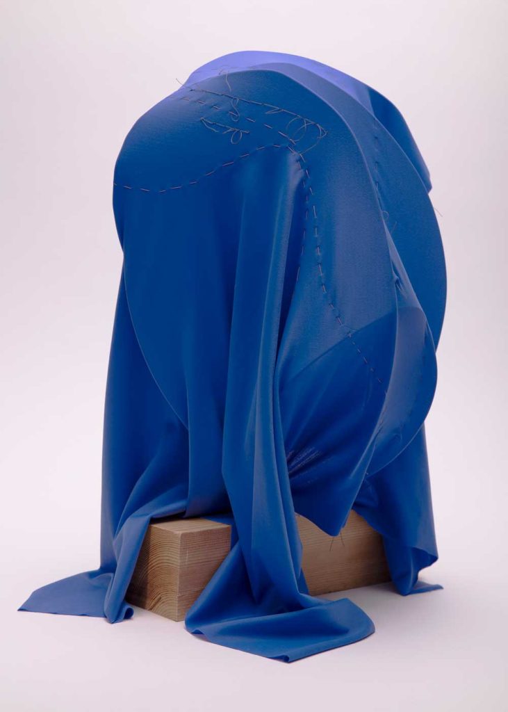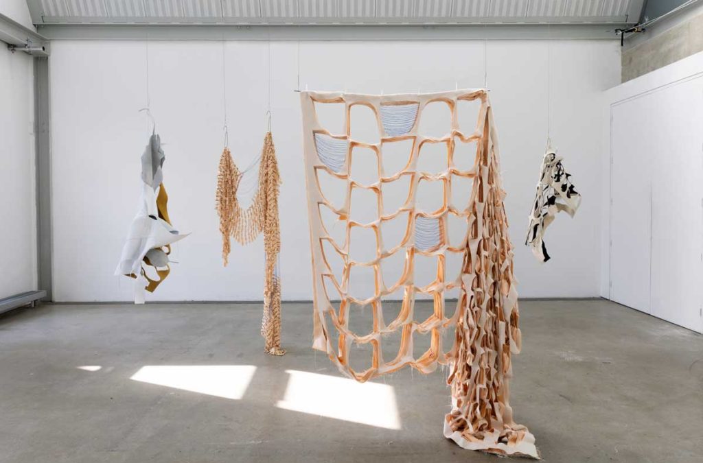 Working intuitively by responding to the nuanced shapes, textures and forms presented by offcuts, Isabel’s sculptural works take on ambiguous forms. With a background in fashion design, she has a fascination in materiality and the transformation of textiles from 2D to 3D through pattern cutting, draping, and stitch. Her recent work has moved away from the garment form as an end-point, to instead work sculpturally and bring into focus the processes, craft and concept present in her work. Improvising through stitching, draping, gathering, tensioning, separating, layering, cutting and joining, Isabel critically interacts with her materials as she seeks to identify their three-dimensional possibilities.
