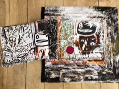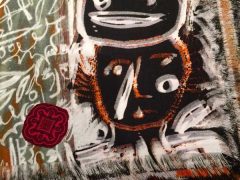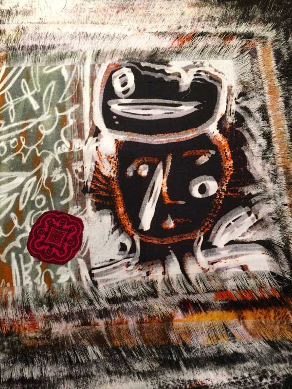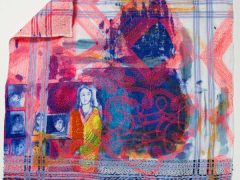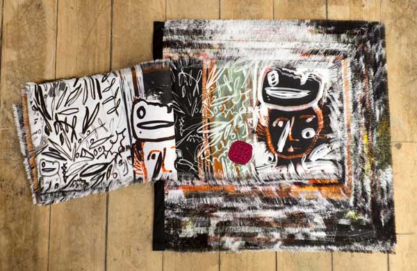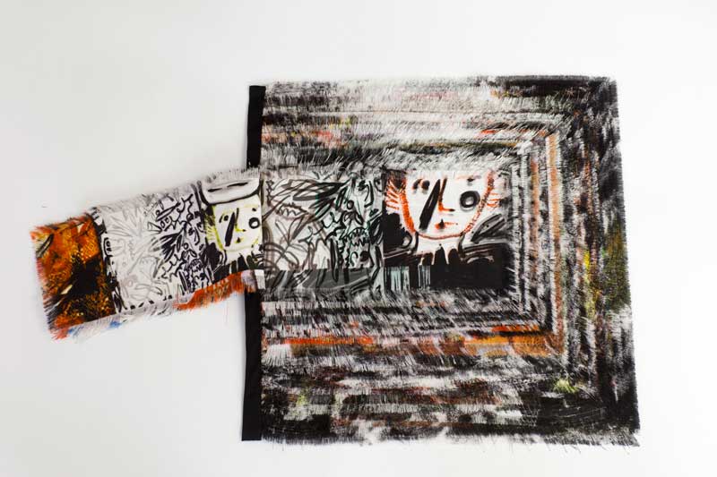 Utilising print to translate her drawn images onto a variety of cloths, she works with them using a series of processes of addition and subtraction. By adding handstitch and removing warp or weft, the surfaces take on new and tactile forms. Through the use of print processes images can be endlessly repeated, so frequently drawn characters and objects appear over time in many different guises and scales.