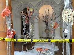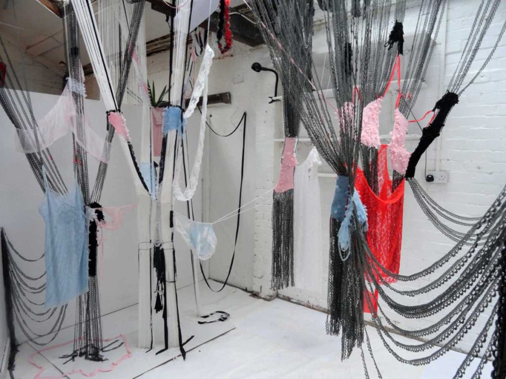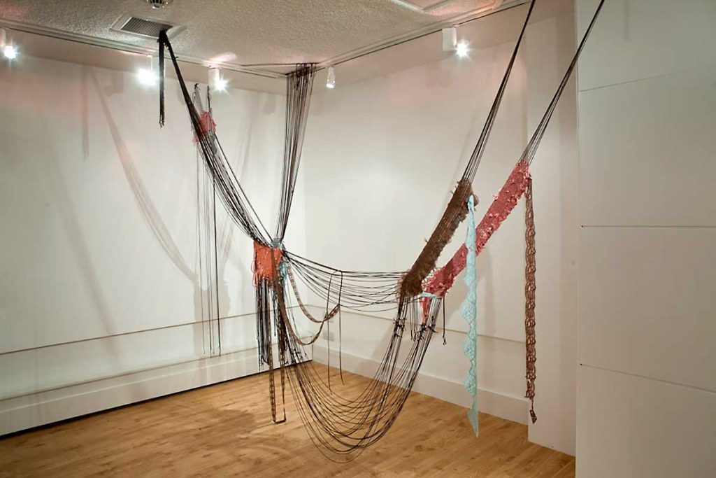 Lucy Brown uses a mixed palette of old, unwanted, second-hand and vintage clothing, hair and personal artefacts as raw material. Works take form in woven installations, anti-form sculptures, site-specific interventions and individual pieces. Narratives explored engage with social issues surrounding body, dress, women’s history, making skills and nostalgia.