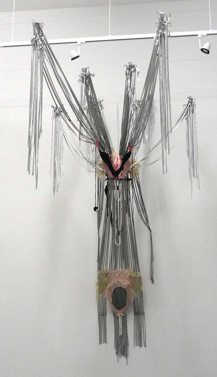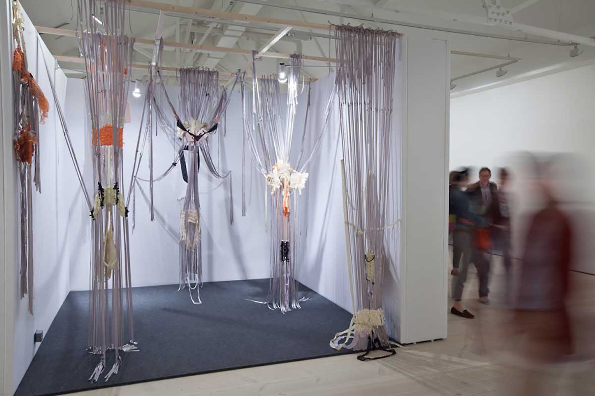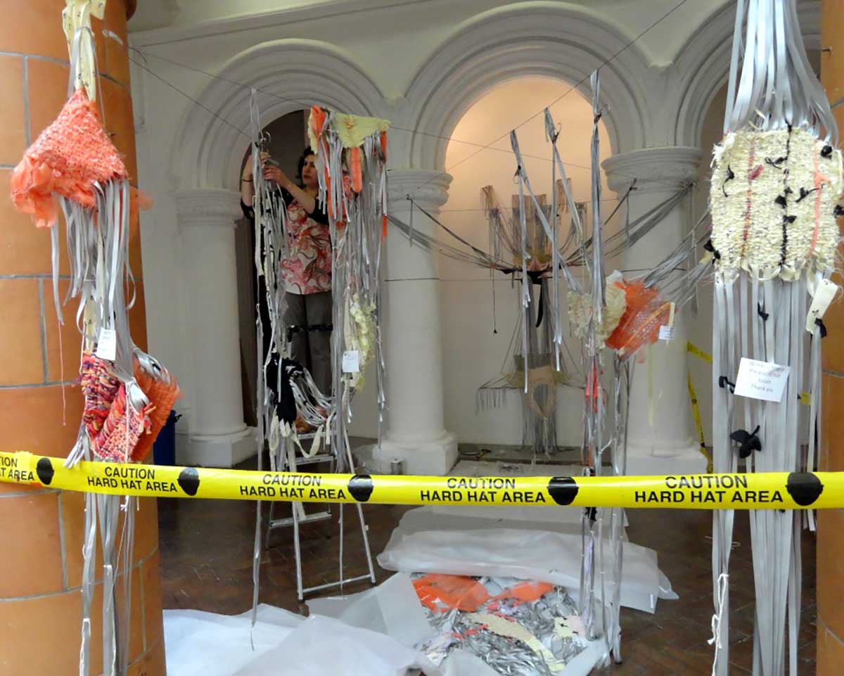 Installation and anti-form works develop over two stages; first stage weaving takes place in the studio on an egar frame loom. Second stage is when weaves are cut loose of the loom and transferred to a space where works are installed, extended and realised. Current works are using multiple selections of clothing, exploring bodily gestures as an extension of an emotion. There are themes around the unfinished and unresolved, meaning that works has are in a constant state of ‘becoming’.