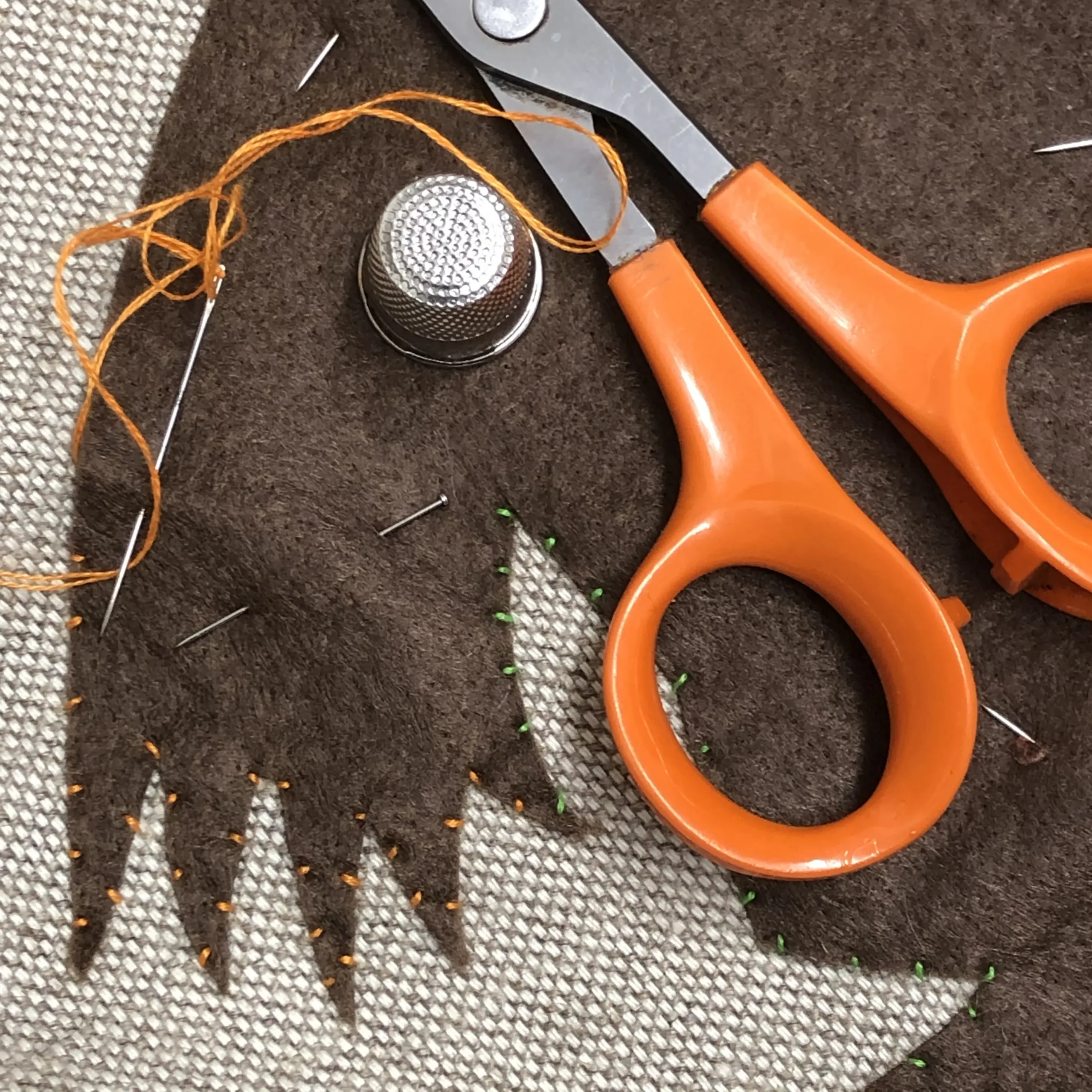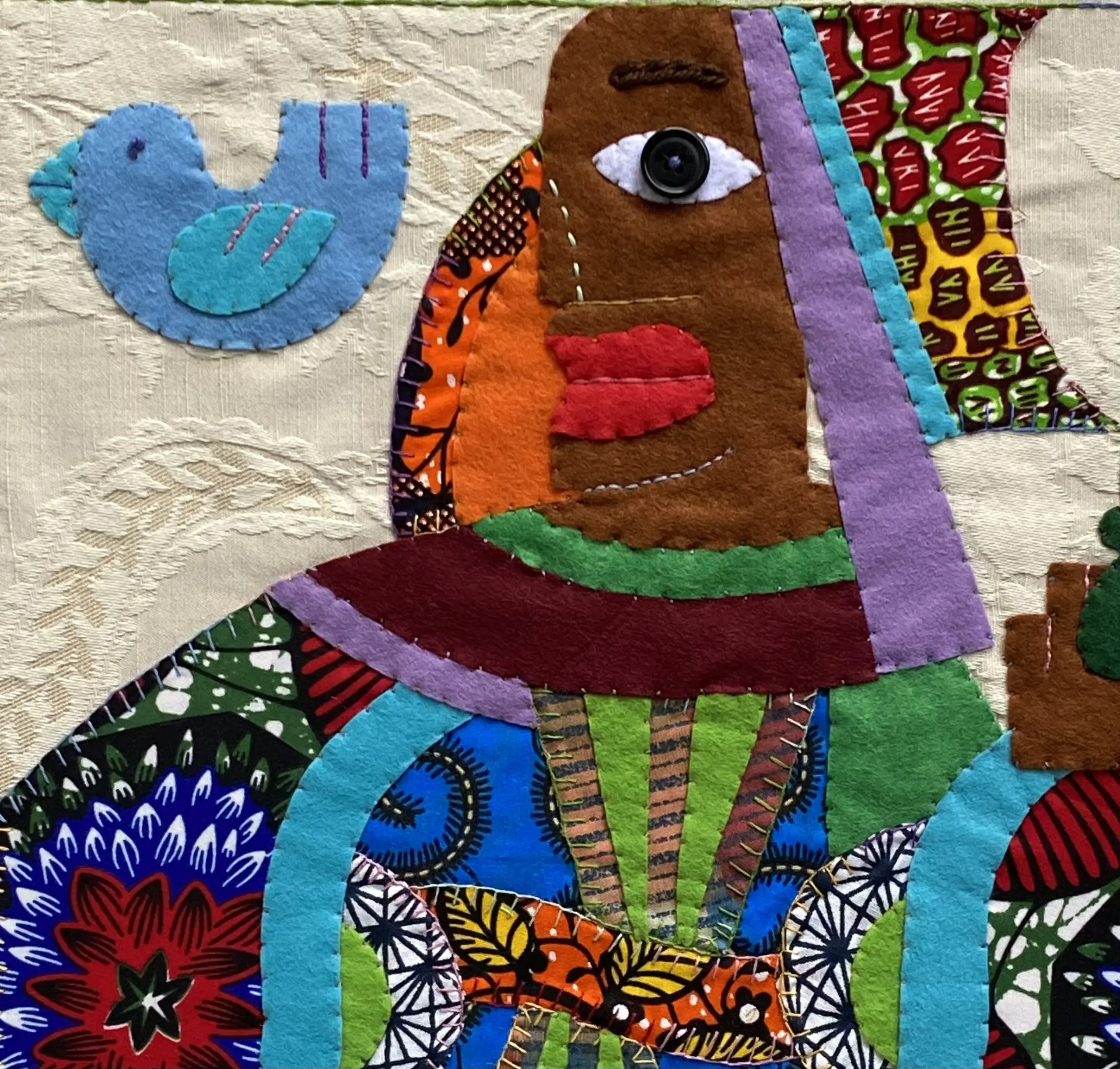 Marcia’s influences at first were the embroidered flags of the Fante people, Ghana, Africa. She originally started her textile work using more elaborate, traditional stitches having studied embroidery at school, but she found that they slowed her down. Looking at the Fante style and execution gave her permission to relax from her formal embroidery training and be more spontaneous. It was also the fearless and visceral paintings of Frida Kahlo which abled her to work on an autobiographical level.
