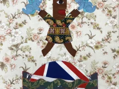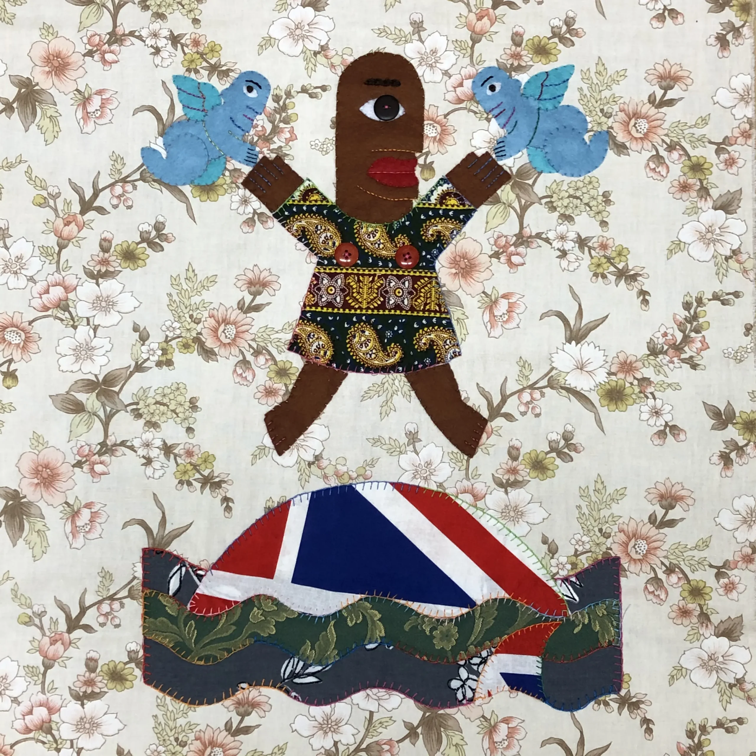 Equally important is her deliberate use of African wax prints as a shorthand to underline her black heritage. Juxtaposed is the use of chintz style materials bought in charity shops or car boot sales which she uses often in the backgrounds and as little hillocks. This denotes that the dominate culture that surrounds her is white English and that she lives on an island.