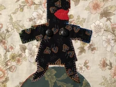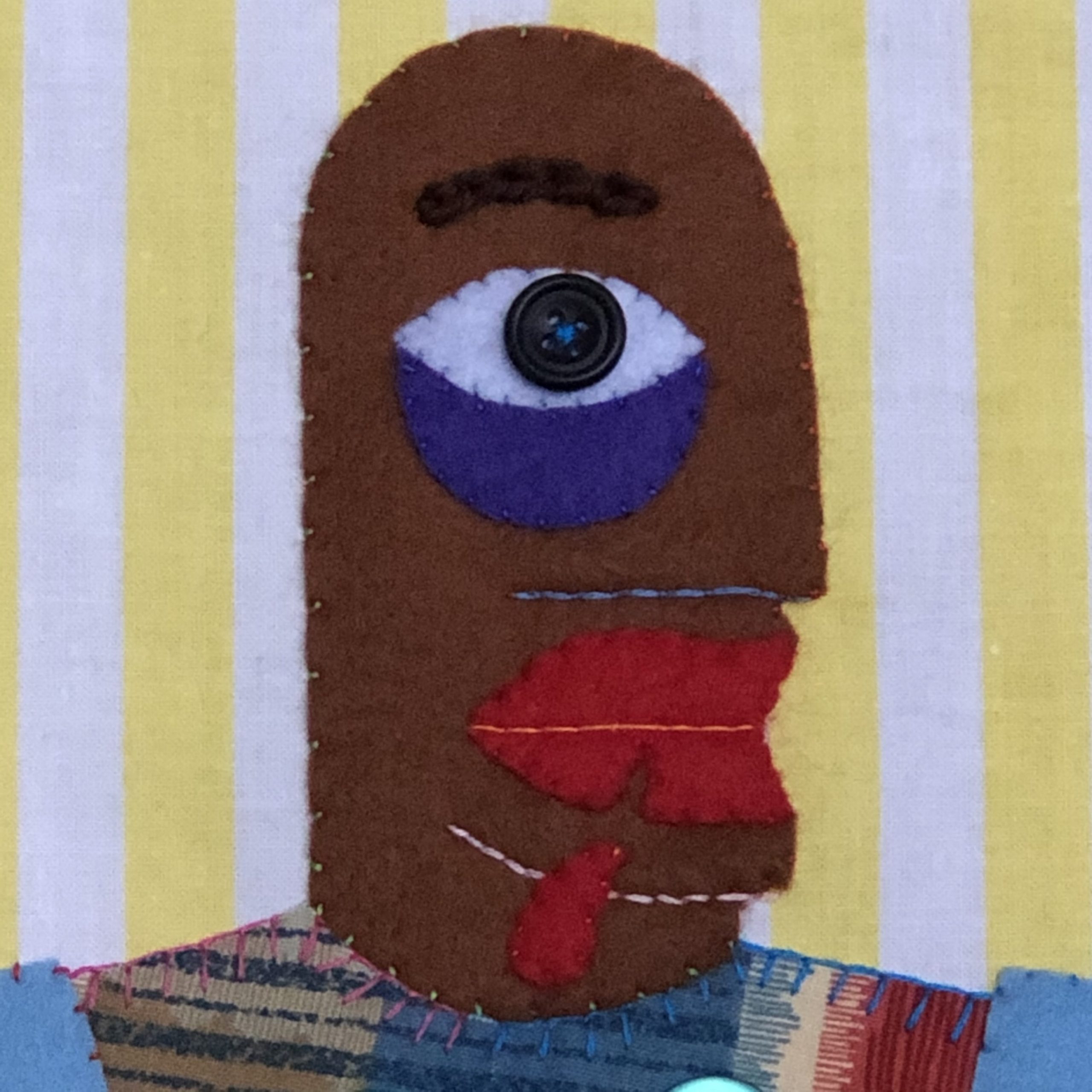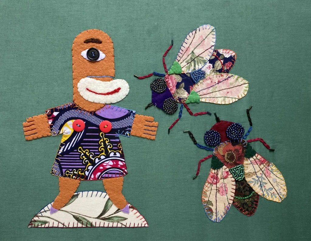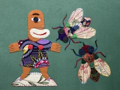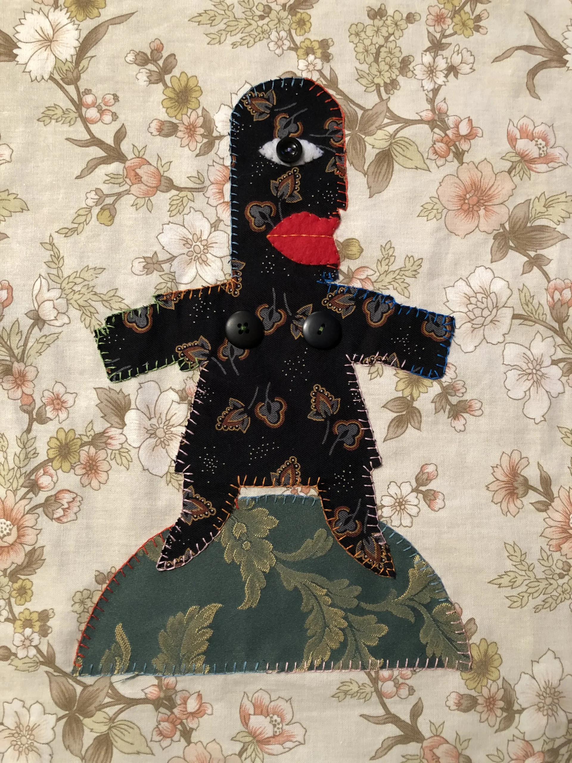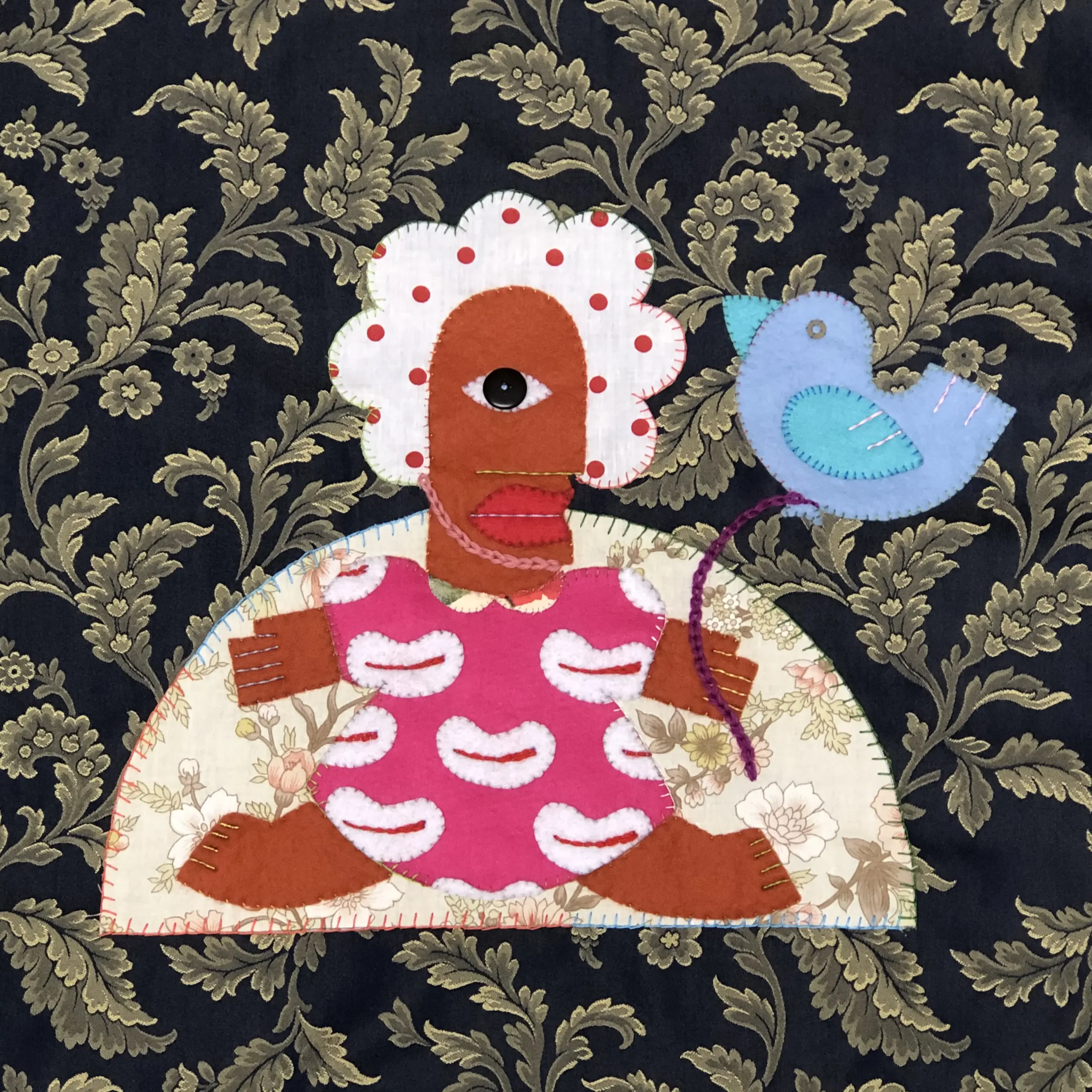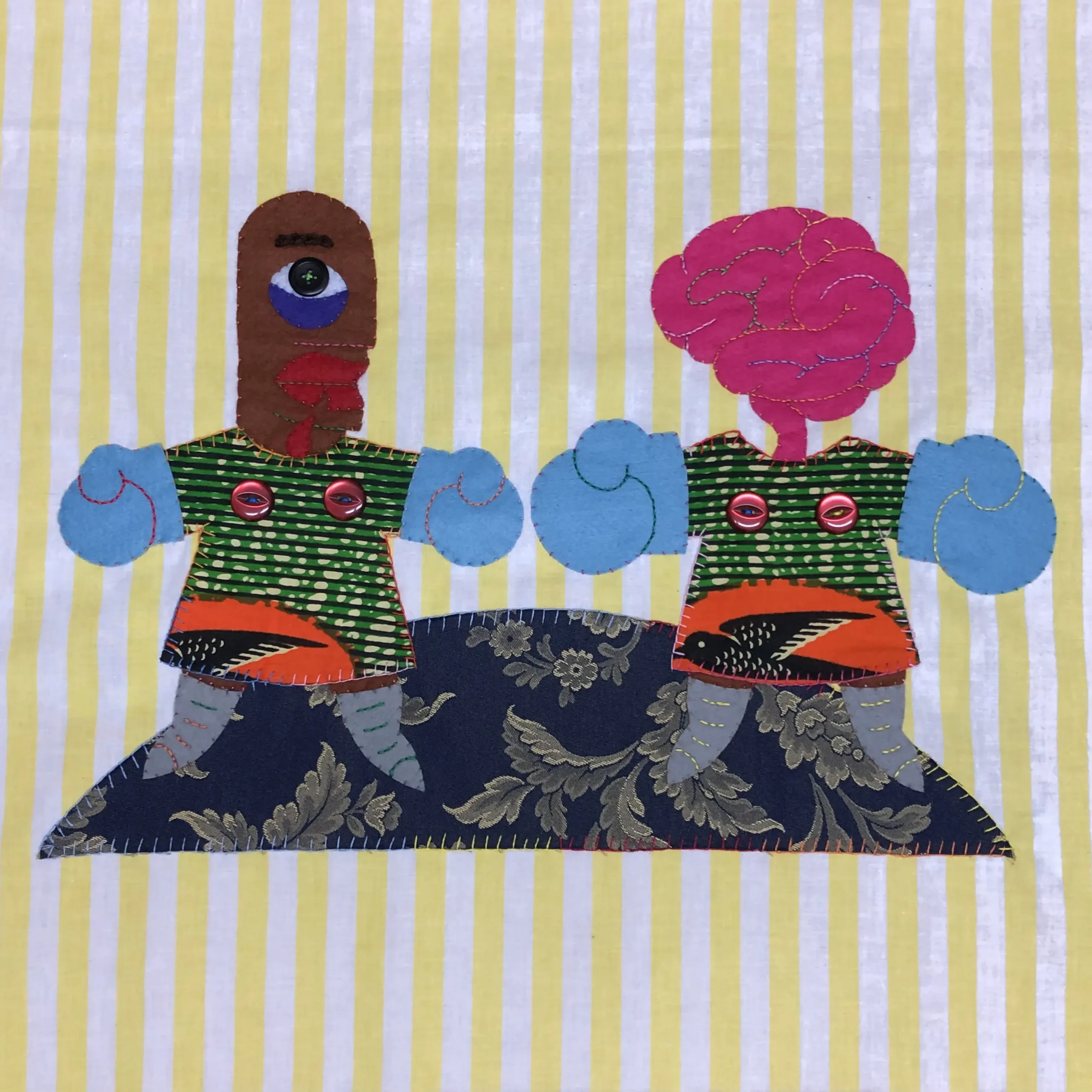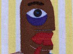 She uses her textiles like a ventriloquist dummy (hence the simplified doll-like figure) to comment on life and her surroundings. The titles of each are of great importance to her, and sometimes are the catalyst for a piece of work.