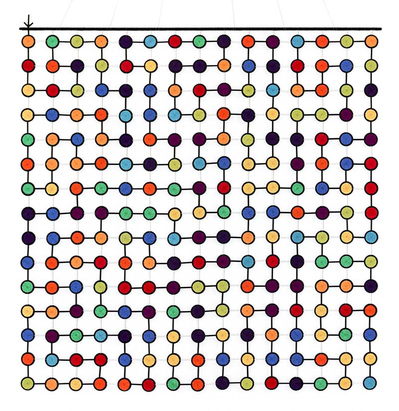 Self-Avoiding Walk is a playful response to the conundrum, “how to make an artwork without making decisions about composition, colour and line?” Pass those decisions on to others. With non-collaborative collaborators, ideas, not people, become the decision makers. Thank you: Rocchini and Life of Riley (Wikimedia Commons) for your mathematical diagram of a self-avoiding walk; Pi, for being our guide; and fashion designer, Julien Macdonald for enthusing about bugle beads, the final piece of the puzzle.