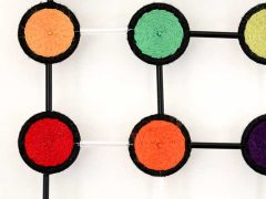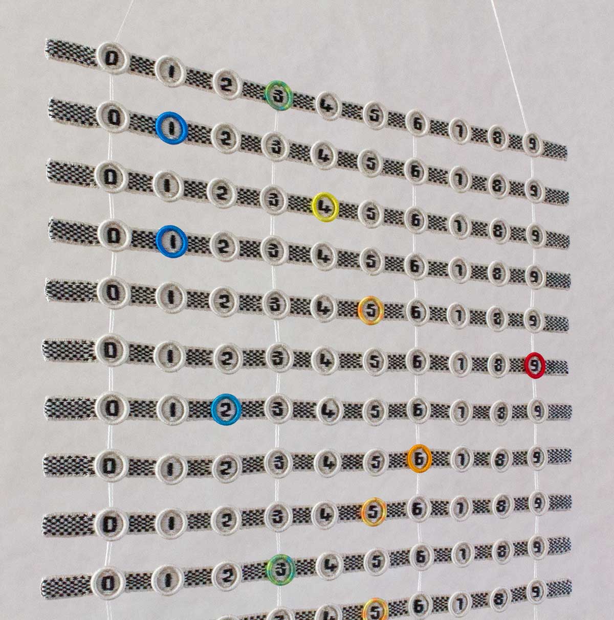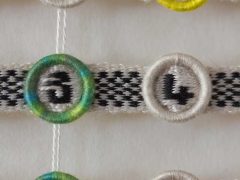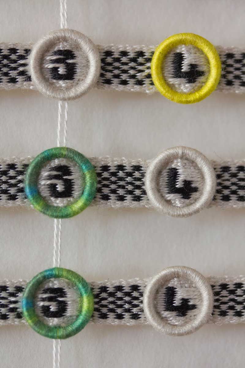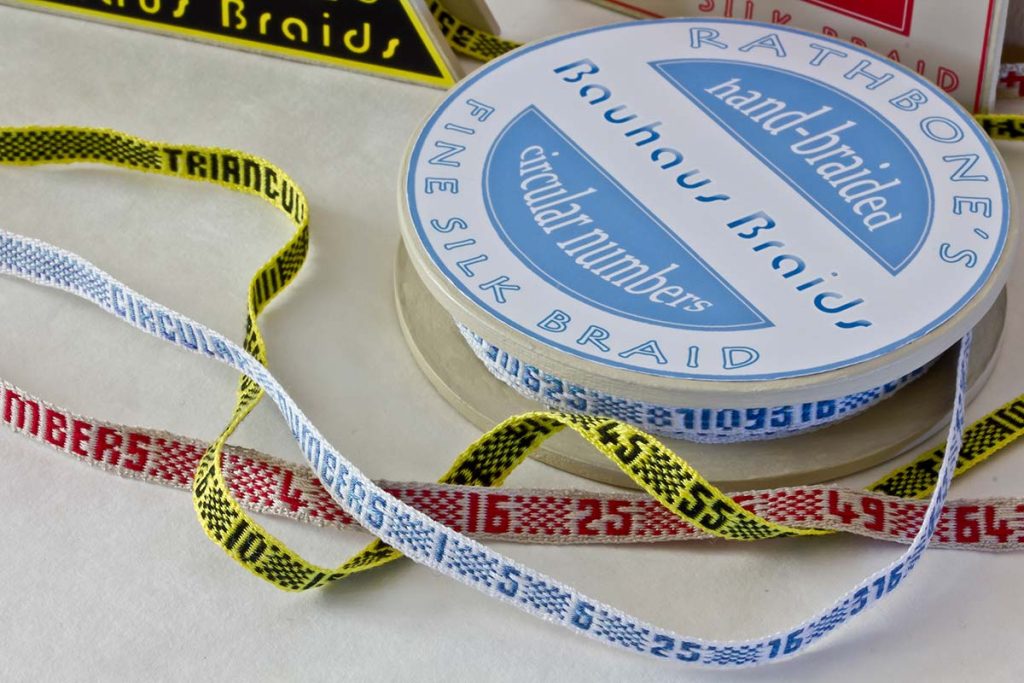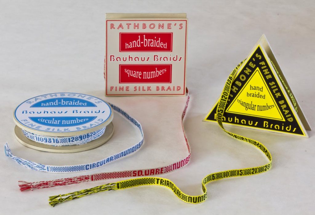 Kandinsky, Bauhaus artist/lecturer, saw colours as shapes. Numbers can be shapes, too. Colours, shapes and numbers combine in a set of three fine silk braids: triangular numbers (yellow, “sharp”, edgy); square numbers (red, “earthbound”, balanced); and circular numbers (blue, “spiritual”, the colour of the heavens).