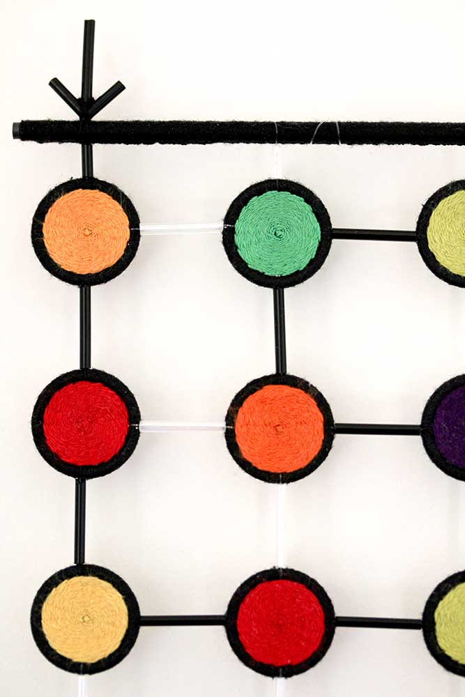 Materials: silk thread, brass rings, wooden battens | Dimensions: 27×84 cm