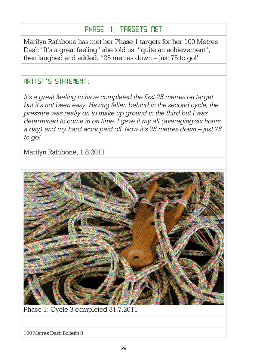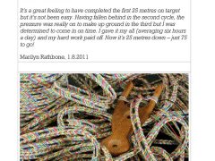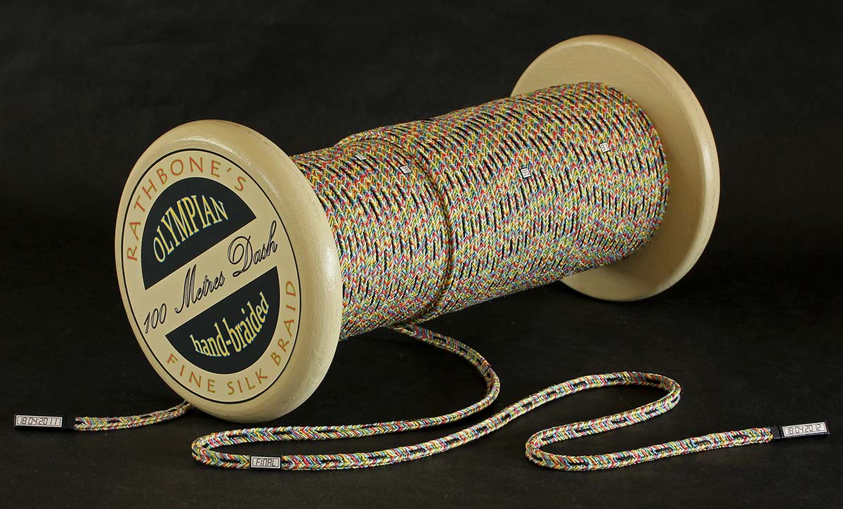 In 2011-12, Marilyn challenged herself to weave 100 metres of braid in the colours of the Olympic symbol. The marathon undertaking took a year and a day to complete. While creating the braid she kept notes, releasing regular bulletins and progress reports as though she really were an athlete in training. These were compiled into a 54 page book & DVD record of the event.