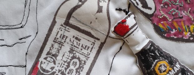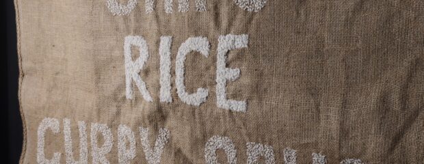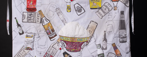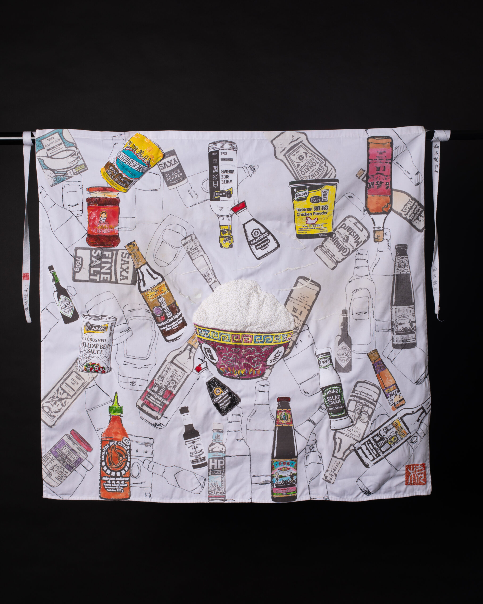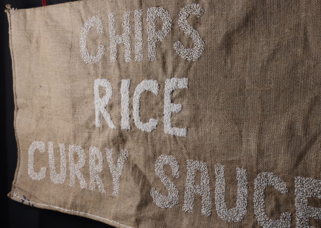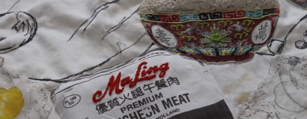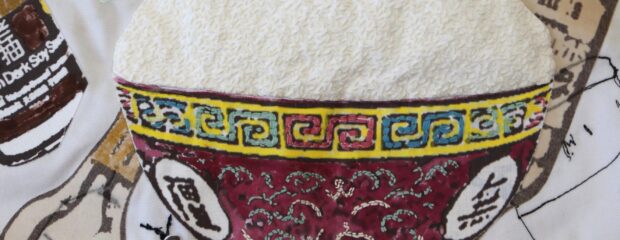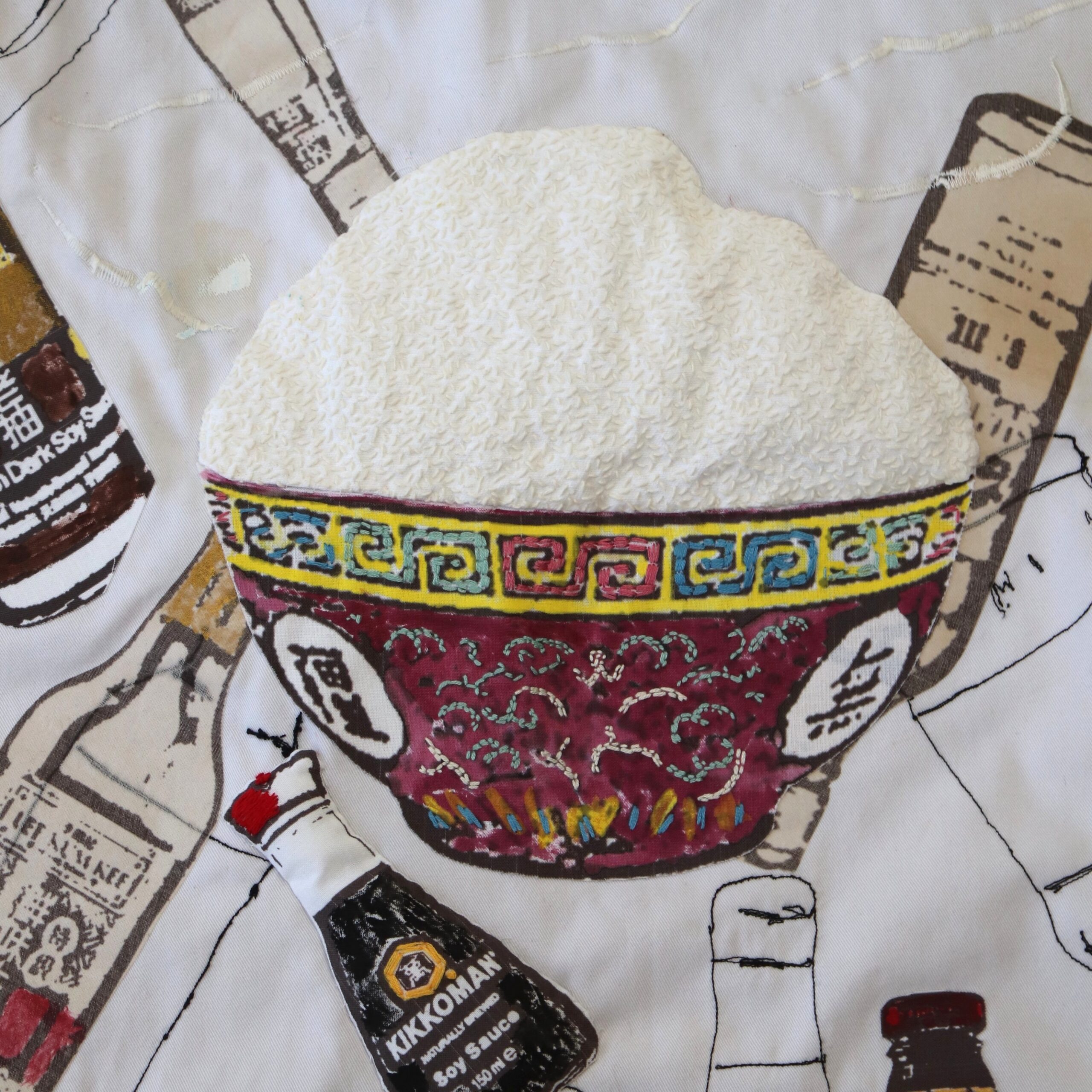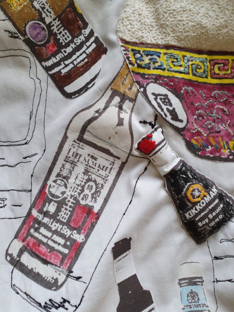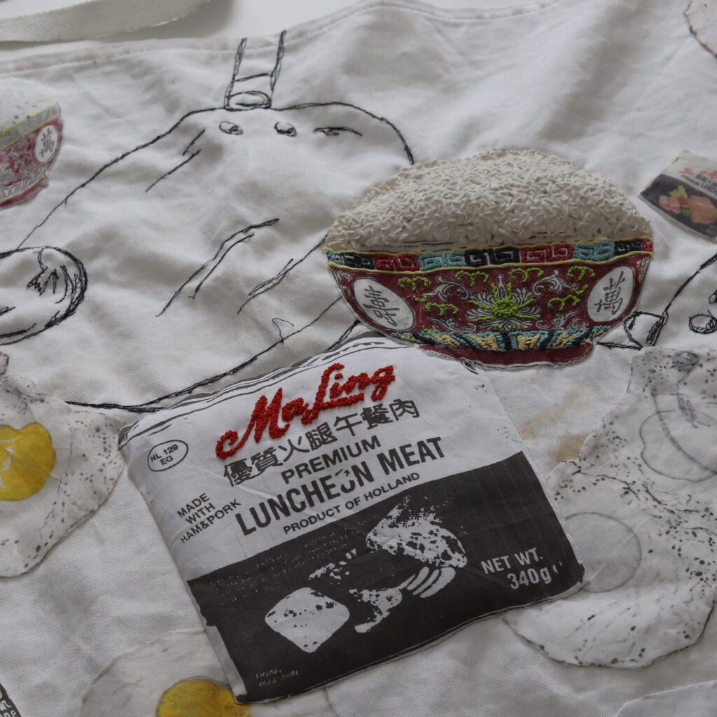 Narrative storytelling lies at the heart of Mei’s work. She often incorporates materials and aesthetics reminiscent of her family home and the take-away where she grew up. Her practice includes mixed-media drawings that capture food from family meals and food memories, blending techniques such as digital print, applique and stitch. Her favourite stitch is seeding stitch, which she often uses to create a visual effect that resembles grains of rice– a metaphor for time, labour and money.