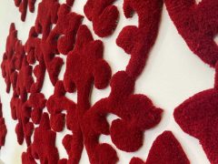 Sally is passionate about the medium of textiles, especially anything wool or yarn related, and aims to use her work to push the boundaries of how the medium is perceived in the wider art world. She also chooses to use natural fibres and British wool where possible in her work. Her pieces range from large site-specific installations, such as knitting with vast amounts of heat ducting, to incredibly small and detailed works using cotton thread on tiny 1mm knitting needles. Repetition in both the stitches she uses as well as making several versions or series of the same work is also a major feature of her art.
