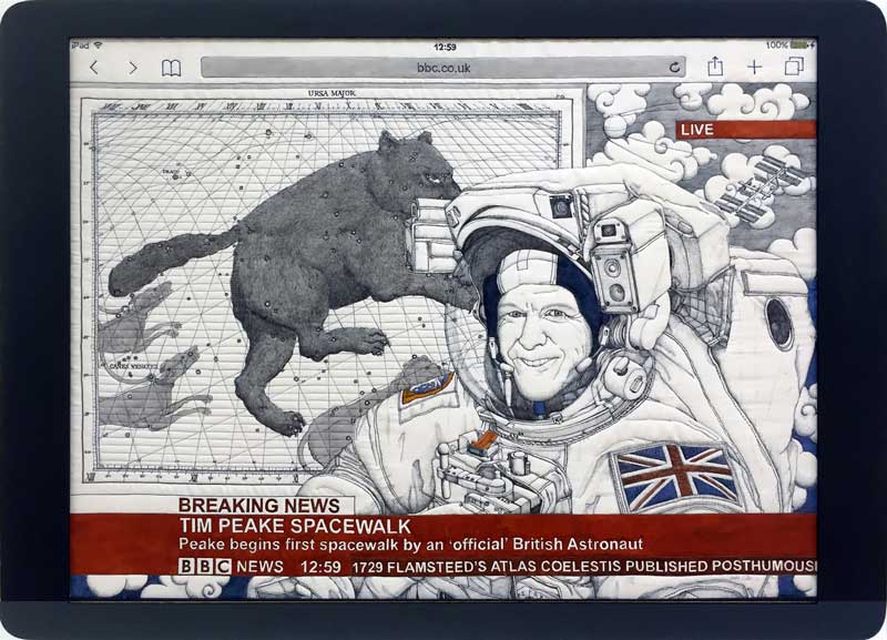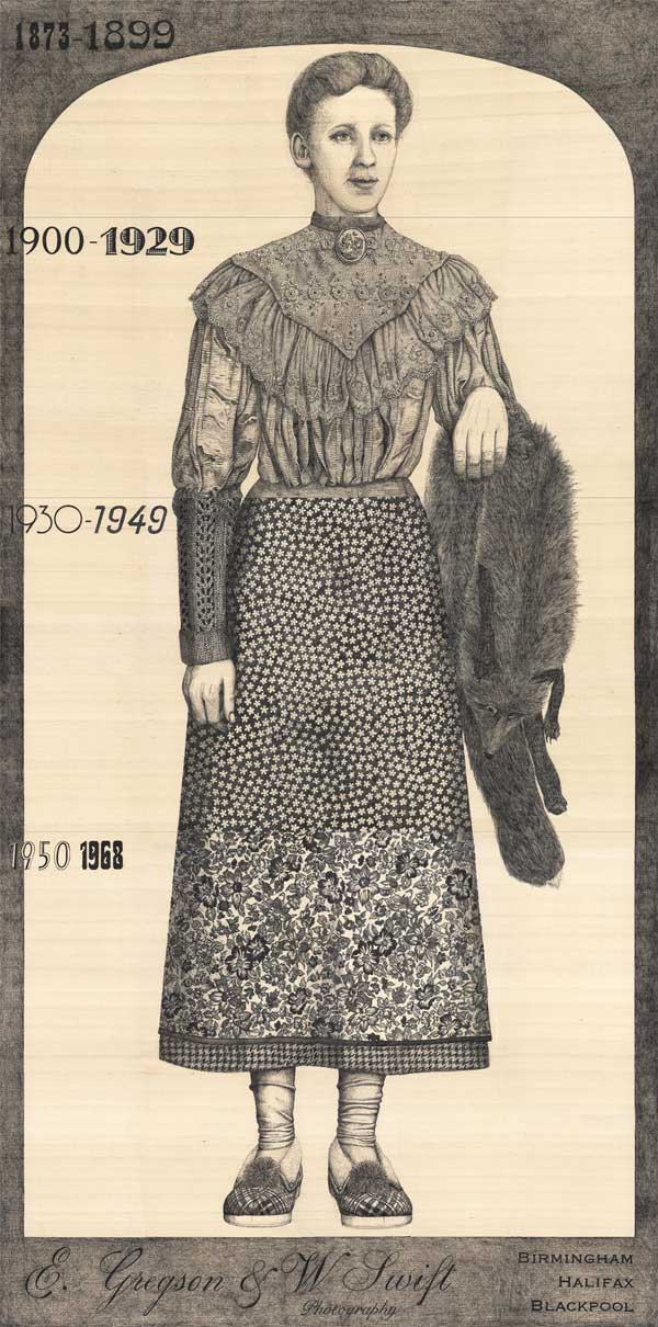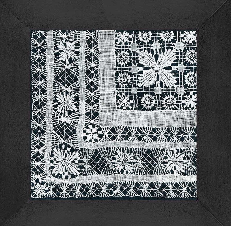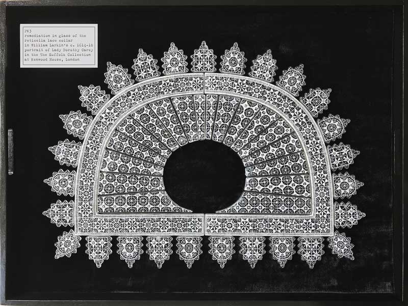 In the mid-90s, following an Arts Council grant to develop new work, Paddy began drawing on fine silks, using technical drawing pens and Indian ink, remediating textures and pattern found in fine and applied art. In 2005, whilst working on the commission for a life-size portrait of Mary Tudor, Paddy remediated the queen’s clothing with drawing. Thus commenced a new body of work informed by lace, embroidered, woven, and printed textiles. Recently, with the help of another Arts Council Grant, Paddy has been exploring drawing onto laserjet cut glass at Sunderland University, using the imagery of lace, this time making wearable glass jewellery.